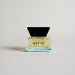 The unique, custom made, rectangular glass flacon’s substantial and solid walls contrast strikingly with the negative space inside, giving the sense of liquid held in space. The weighted, post-consumer glossy black cap provides a sculptural, artful feel that sits well on any vanity.